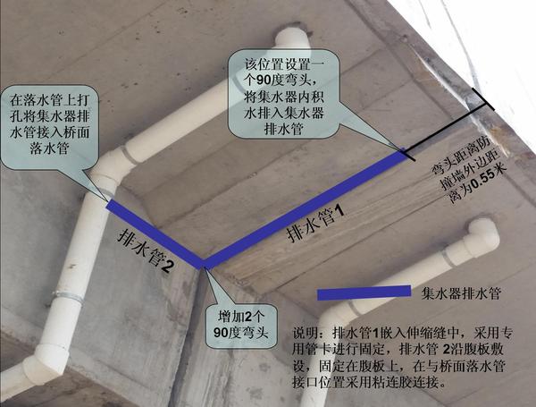 為有效排除伸縮縫內積水及避免伸縮縫位置滲漏對橋梁、墩柱外觀及實體質量的影響,二環南路四標項目部在公司總工辦指導下,進行伸縮縫集水器排水管安裝。