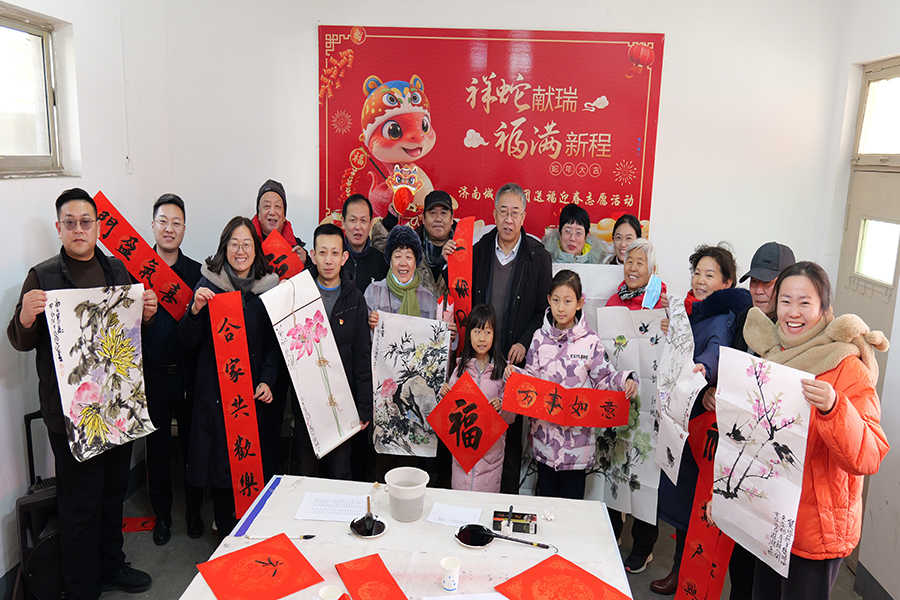 為深入貫徹中央社會(huì)工作會(huì)議精神,弘揚(yáng)傳統(tǒng)文化,豐富社區(qū)生活,1月10日,匯通集團(tuán)第一支部聯(lián)合濟(jì)南市文聯(lián)、濟(jì)南市美協(xié)共同走進(jìn)千佛山西路社區(qū)、歷園新村社區(qū)開展“迎新送?!蔽乃嚮菝穹?wù)活動(dòng)。 活動(dòng)中,濟(jì)南市文聯(lián)副主席、濟(jì)南市美協(xié)主席李慶杰,山東省文聯(lián)委員、濟(jì)南市美協(xié)副主席兼秘書長(zhǎng)張春艷,濟(jì)南市美協(xié)副主席張波、吳疆、李軍,濟(jì)南市書協(xié)副秘書長(zhǎng)任清,青年作者楊淑涵、王文秀等書畫家現(xiàn)場(chǎng)揮毫潑墨,為社區(qū)群眾書寫春聯(lián)、福字,并捐贈(zèng)寓意美好的書畫佳作,以筆墨為媒,將新春的祝福與溫暖傳遞給每一位社區(qū)群眾。 居民們手捧著火紅的春聯(lián),心中滿載著“福”氣,臉上洋溢著幸福的笑容,一幕幕歲月靜好在這個(gè)瞬間凝結(jié)成時(shí)光印記,溫暖