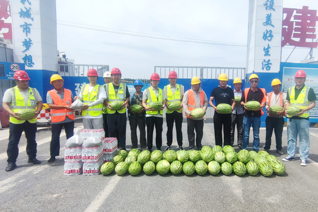 烈日炎炎、驕陽似火,進入7月以來,連續(xù)多日發(fā)布高溫橙色預警,為做好高溫期間安全生產(chǎn)工作,保障現(xiàn)場施工安全,匯通集團分會組織開展“夏送清涼”慰問一線活動,深入工地、走近工友,把清涼送到施工一線、把關(guān)懷送到職工心坎里。 7月6日,分管經(jīng)理袁鵬、綜合辦公室主任馬婕帶領(lǐng)匯通集團分會小組走進項目部,開展“夏送清涼”慰問一線活動,為每個施工班組送上清熱解渴的礦泉水、西瓜、綠豆等防暑降溫物資,對炎炎夏日奮戰(zhàn)在一線的廣大職工及勞務人員表示親切慰問,叮囑一線人員要保證人身安全,適當科學合理安排作息時間,根據(jù)氣溫情況,避開高溫時段,切實做好防暑降溫工作,同時要求各施工隊伍堅持“安全高于一切、質(zhì)量重于泰山”理