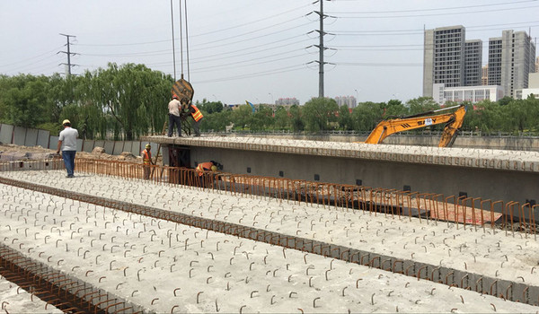 5月18日上午9時(shí),濱河南路拓寬改造工程第一塊T型板梁正式開(kāi)始吊裝。該橋設(shè)計(jì)寬26米,橋跨18米,橋型為一跨簡(jiǎn)支變截面肋梁橋,主梁采用裝配式后張預(yù)應(yīng)力混凝土變截面T梁,吊裝后濕接。經(jīng)過(guò)連續(xù)不間斷作業(yè),于下午16時(shí)圓滿(mǎn)完成七塊主梁、兩塊邊梁,共計(jì)九塊板梁的吊裝任務(wù),比原計(jì)劃提前一天,至此標(biāo)志著橋梁主體結(jié)構(gòu)工程順利完成。為保障此次吊裝作業(yè)的順利進(jìn)行,項(xiàng)目部科學(xué)部署,精心組織,提前策劃,并與交警等相關(guān)部門(mén)充分溝通,確定合理的運(yùn)輸路線(xiàn)和時(shí)間。項(xiàng)目部設(shè)立吊裝安全保障小組、明確責(zé)任分工;詳細(xì)制定切實(shí)可行的施工方案,做到以方案指導(dǎo)施工;認(rèn)真做好各項(xiàng)施工前準(zhǔn)備工作:包括技術(shù)準(zhǔn)備、機(jī)械設(shè)備準(zhǔn)備、勞動(dòng)組織準(zhǔn)備、施