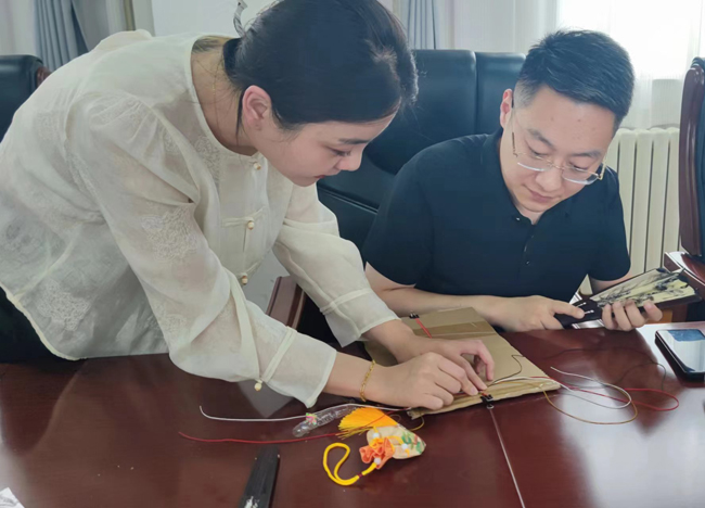 五色絲線系臂、佩香囊是端午節傳統習俗之一。在專業老師的指導下,細細的彩線在職工們的手指間飛舞,變成了手腕上一條條漂亮的五彩繩。